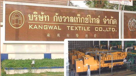 โครงการ KANGWAL TEXTILE ราชบุรี ขนาดกำลังไฟฟ้า 13.00 MW ใช้เชื้อเพลิงก๊าซธรรมชาติ เป็นระบบ TRI-GENERATION ใช้ความร้อนสูญเสียของเครื่องยนต์มาผลิตไอน้ำและน้ำร้อน ป้อนเข้า Absorption Chillers เพื่อผลิตความเย็น ใช้ในกระบวนการผลิต พ.ศ. 2547